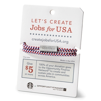Hats off to Starbucks for linking with the Opportunity Finance Network (see: createjobsforUSA.org) to raise awareness for job creation — and actually help fund entrepreneurs. Starbucks donated 5 Mil to kick start the effort. The idea behind the wristband is awareness AND, it’s also about funding underserved businesses (aren’t banks supposed to do this?). I see this as a very creative way to create jobs. It’s a donation you’re making, but I like the idea that it funds growth and jobs directly.